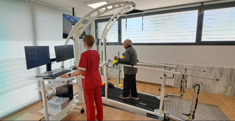 Las salas UTIs de rehabilitación tanto a nivel neurológico como funcional es un sello de identidad de los centros Vitalia con terapias innovadoras y tecnología de última generación. Así nos lo explica Judit Royo, directora del centro Casablanca y una de las coordinadoras de UTIs a nivel nacional del grupo “ Es un sistema biomecánico donde intentamos reducar la marcha, combinamos el ejercicio dual, ejercicio físico como la marcha, la estabilidad con una tarea cognitiva” Chema añade que ”la idea es que la residencia sea una plataforma de servicios del barrio para el barrio. Por esto los centros de Vitalia Home están integrados en los barrios, tenemos tantos pacientes de la residencia como de la zona de influencia. Tenemos que conseguir que todos nuestros residentes estén levantados».